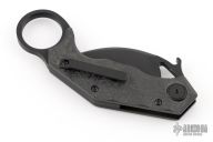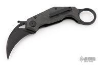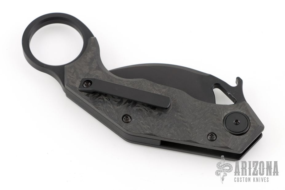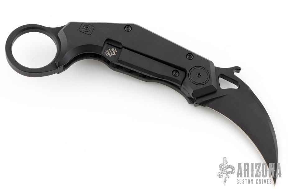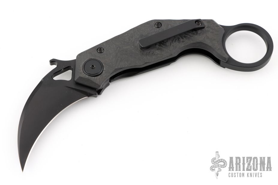 This Karambit by M3 Tactical Tech features a black blade with thumbhole and wave feature. The handle has a carbon fiber and black titanium frame with matching backspacer and tip up clip. Nice detent, lockup and blade seating. Excellent condition. Comes with original box and zippered case.