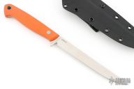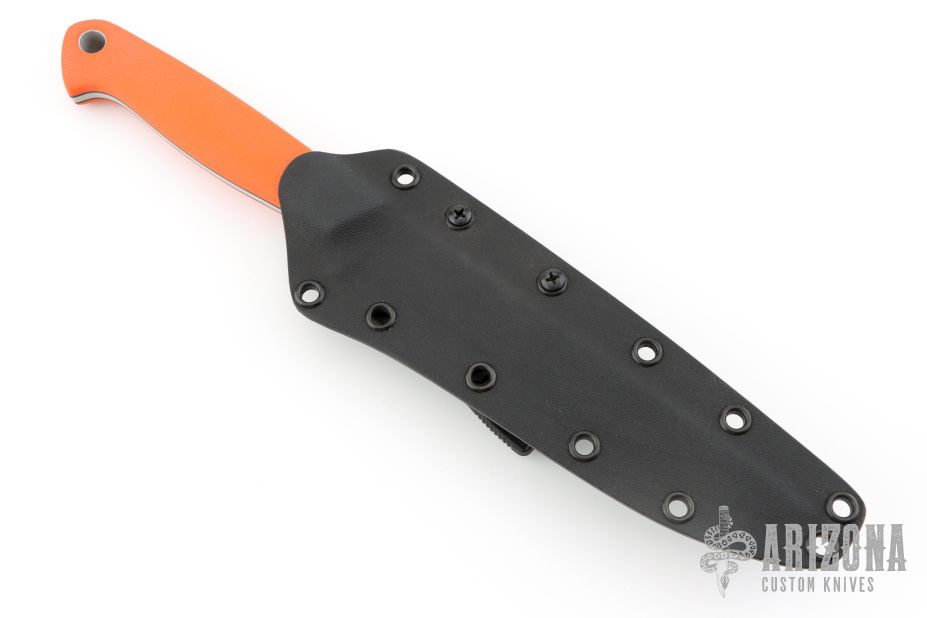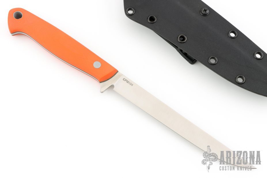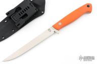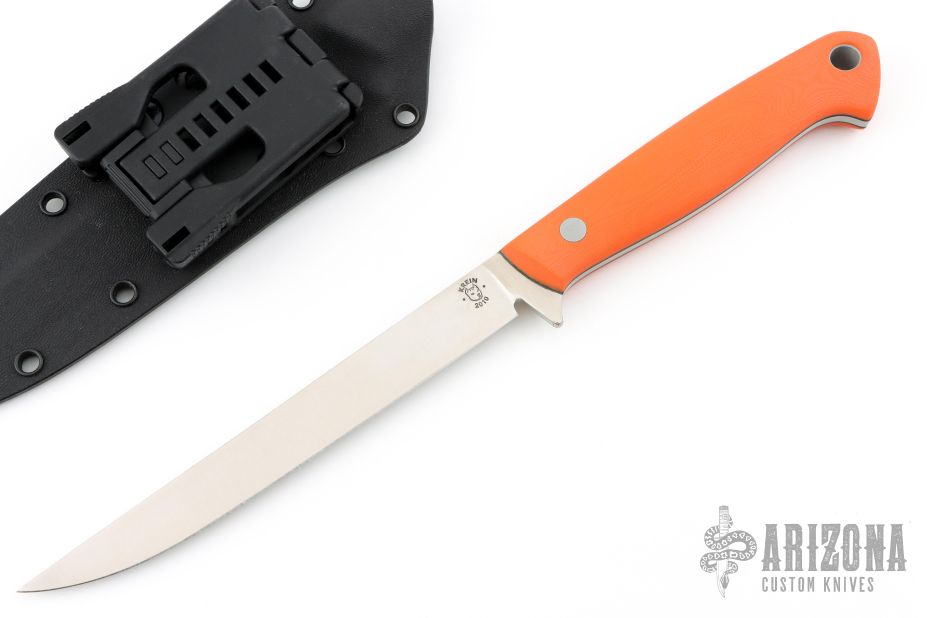 This Coho Fillet Knife by Tom Krein features a satin finished blade with .127" blade stock and .767" blade depth, full tang construction. The handle has orange G-10 scales with black liners and aluminum pins. Comes with a kydex sheath with TekLok. Dated 2010. Has some patina. Excellent condition.