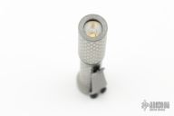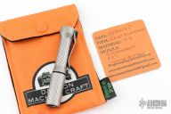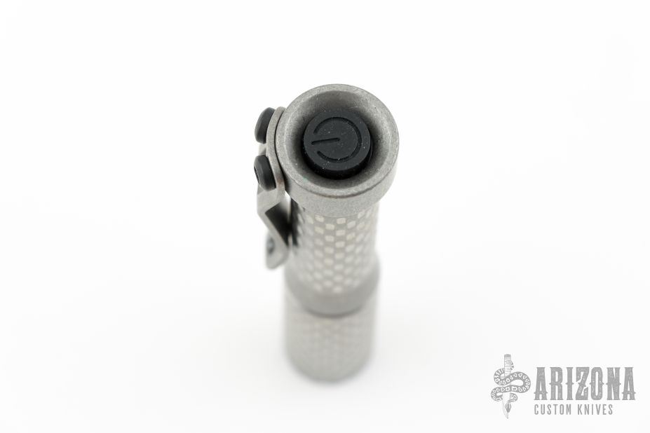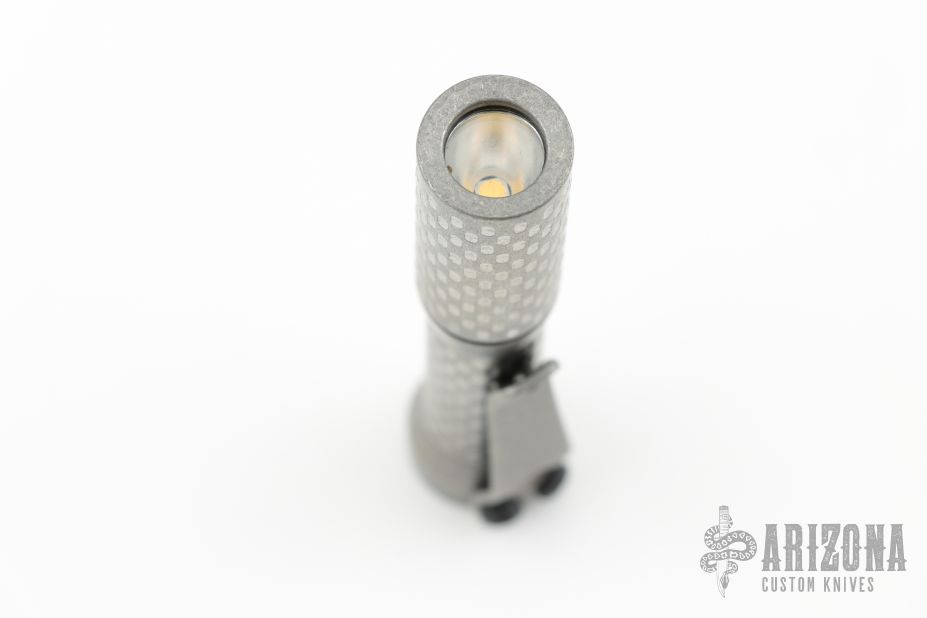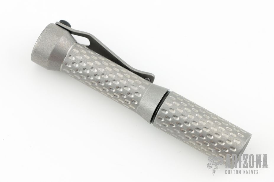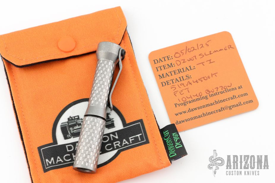 This flashlight from Dawson Machine Craft features a titanium body. 519A 4500K emitter. Reflector optic. Mineral window. Uses a single 10440 button top cell. Battery is not included.  This piece comes with a custom pouch and COA, dated 05/02/25.  New From Maker.