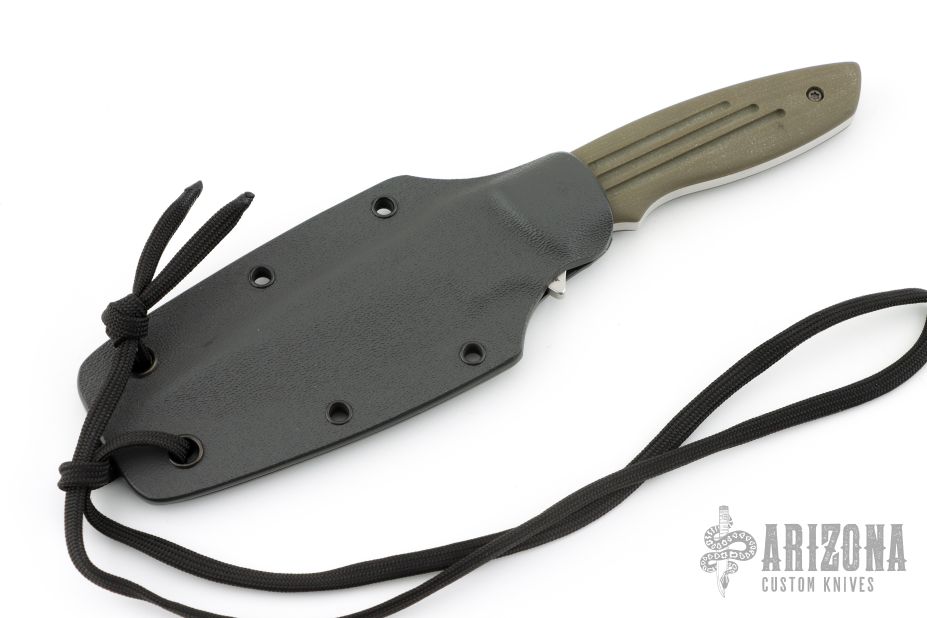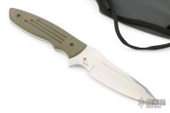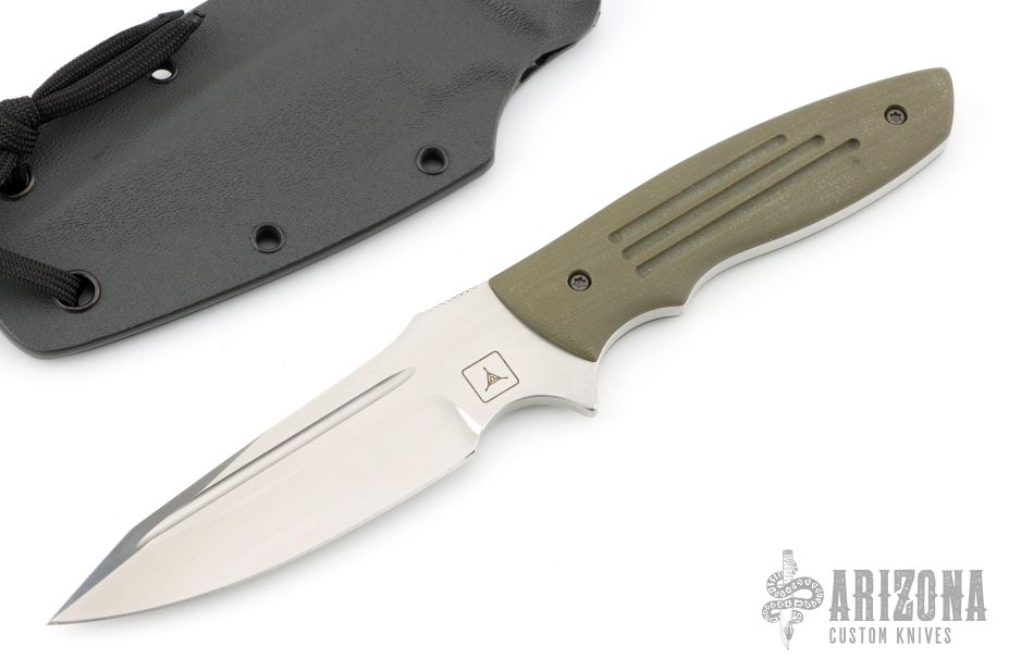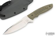 This Dauntless Fixed Blade by Kirby Lambert features a hand rub satin finished blade with notched thumbrest and fullers, .145" blade stock and 1.038" blade depth, full tang construction. The handle has green G-10 scales. Comes with a kydex sheath. Excellent condition.