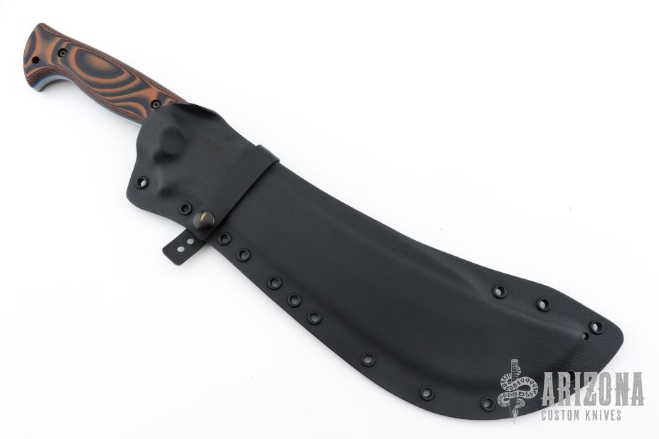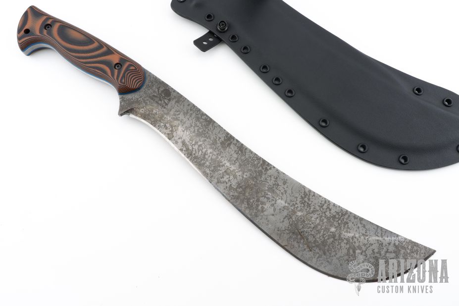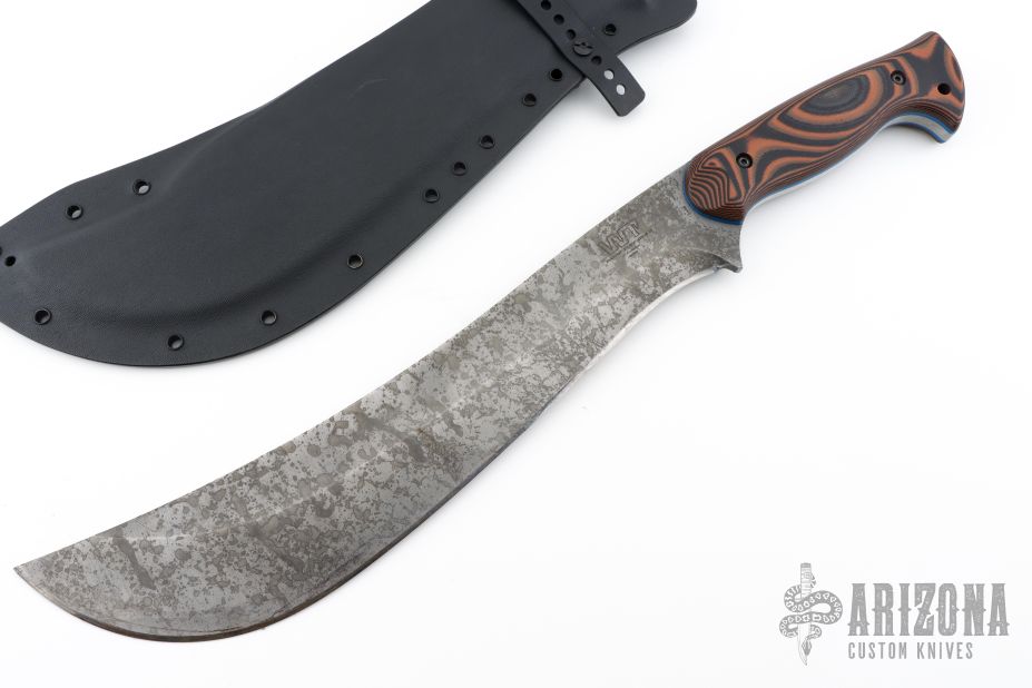 This Ape-X by Work Tuff Gear features a toxic apocalyptic finished SK85 Steel blade with .229" blade stock and 2.437" blade depth, full tang construction with black/orange G-10 scales and blue G-10 liners. Comes with a kydex sheath and zippered case, comes with belt loops and hardware as well. 1st Production 08/2022. Excellent condition.
