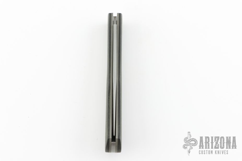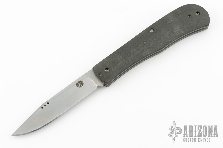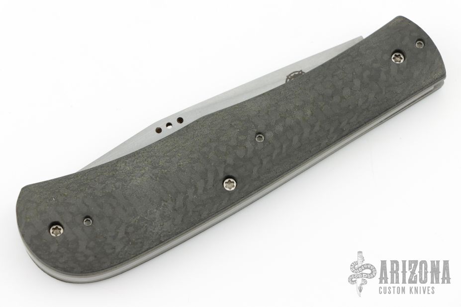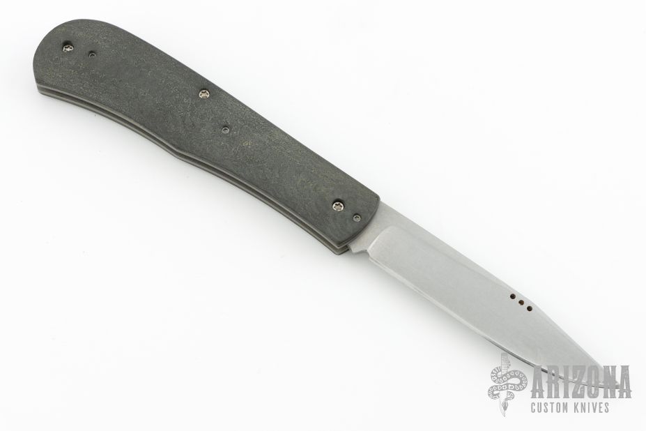 This Slipjoint by Aaron Frederick features a stonewashed clip point blade. The handle has carbon fiber scales, bead blasted titanium liners and a tumbled stainless steel spring. Has half-stop. Has a couple light scratches, otherwise excellent condition.