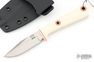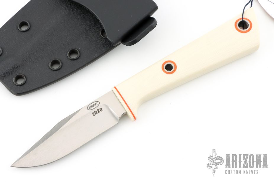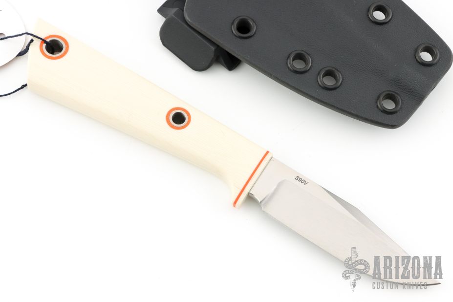 This Traverse prototype from Shane Sibert features a hand rub satin finished clip point blade with crowned blade spine, .132" blade stock and .841" blade depth, hidden tang construction. The handle is white G-10 with orange spacers and thong surrounds. Comes with a kydex sheath w/ TekLok, maker's zipper case and COA dated 08/2020. Marked 2020 on the blade. Excellent condition.