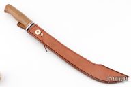 This Parang from Citadel Knives features a mirror polished blade with .266" blade depth and 1.566" blade depth, hidden tang construction. The handle has a stainless steel guard, wood grip with red/white spacers. Includes a brown leather sheath with belt loop and a zippered case. Excellent condition.