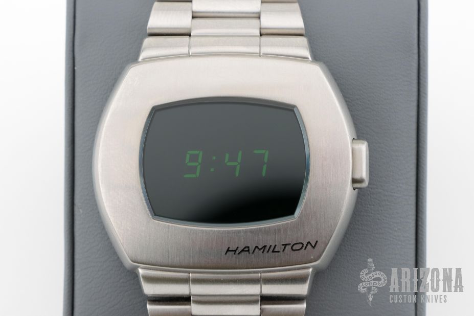 Celebrating the revolutionary mark the original Pulsar made on timekeeping, this all new Hamilton American Classic PSR Digital Quartz watch makes its own statement with retro style. A sleek 41mm stainless steel case features a 12-hour AM/PM display that stays true to the original Pulsar from the 1970s. The watch is water resistant to 100 meters and stainless steel bracelet that secures comfortably with a folding clasp