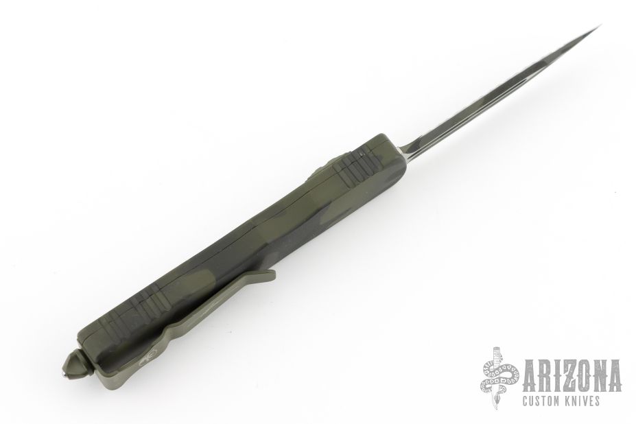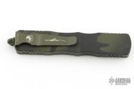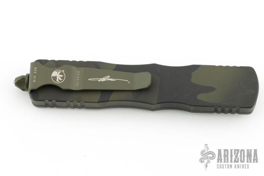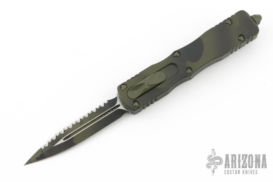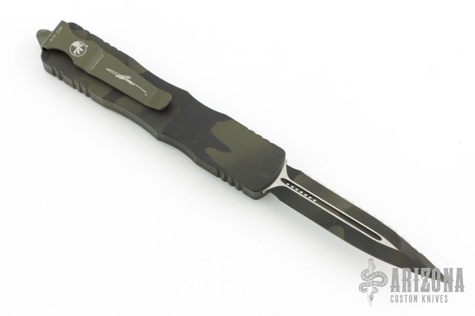 This Dirac OTF automatic by Microtech features a D/E camo cerakote blade with a fully serrated edge. The handle is camo cerakote aluminum with matching stainless steel tip down clip. Serial number 226 and dated 10/2022. Has a couple light scuffs/scratches/dings in the frame. Great condition otherwise.