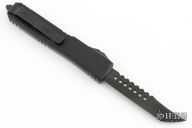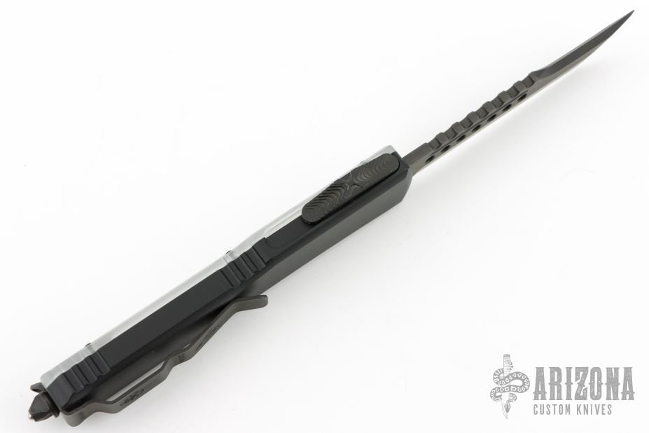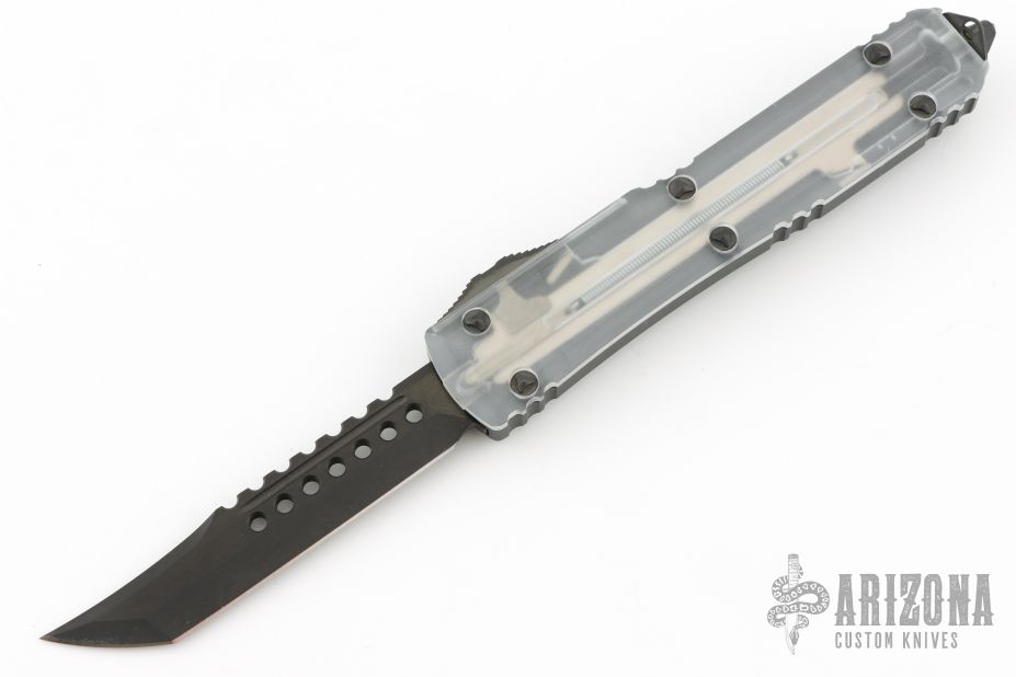 This Ultratech Hellhound by Microtech Knives features a black shadow DLC blade with notched thumbrest and fullers, false top edge. The handle has a black aluminum frame with clear top and tip down black stainless steel clip, black DLC hardware, black titanium thumbslide. Dated 10/2022 and s/n 049. Has some scuffs and scratches, great condition otherwise.