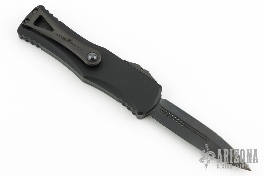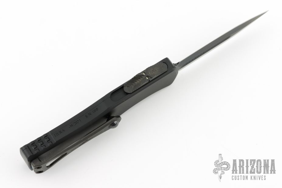 This Hera by Microtech Knives features a double-edged DLC stonewashed blade with dual fullers. The handle has a black aluminum frame with a tip down DLC titanium clip with ceramic ball inset. Dated 08/2021 and s/n 068. Limited edition with trit inlaid button. Has some light scuffs and scratches, excellent condition otherwise.
