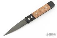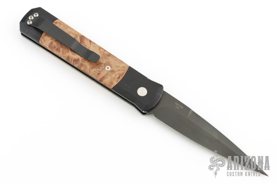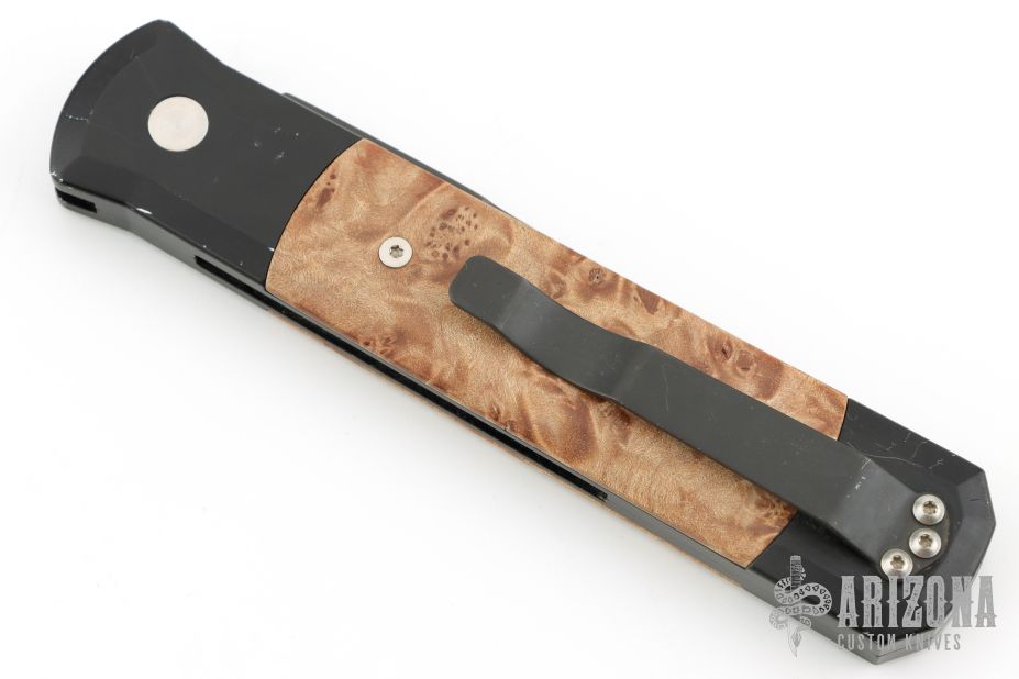 This Godfather from Pro-Tech knives features a satin finish spear point blade with swedge. The handle is comprised of black aluminum frame with maple burl scales. Black stainless steel tip up pocket clip. Great blade seating, action and lock up. Blade appears to have been gun blued by the previous owner. Marked 154CM and C07. Has some scuffs/scratches/dings in the frame. Good condition otherwise.