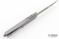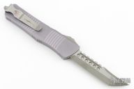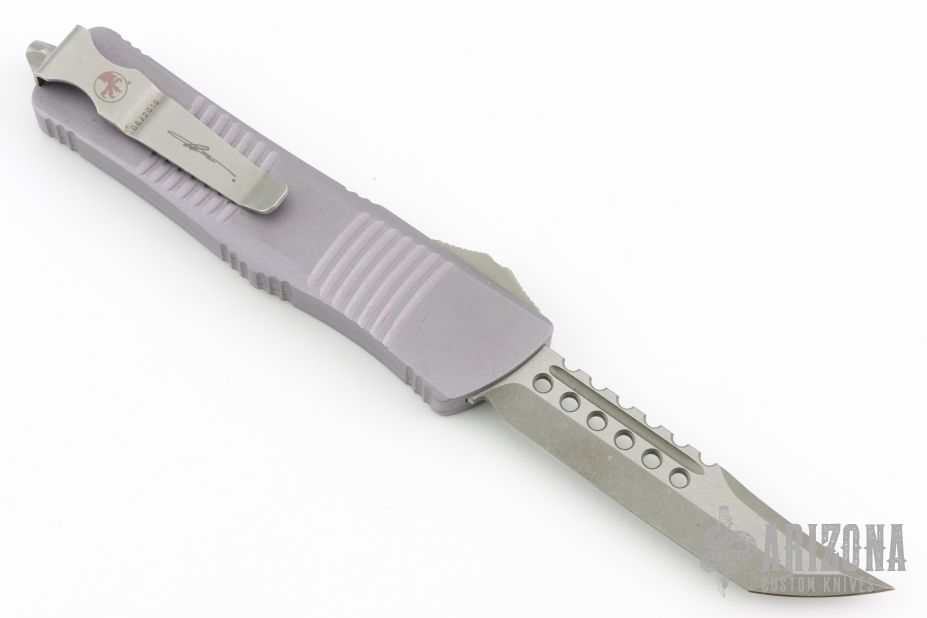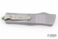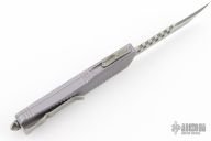 This Troodon by Microtech Knives features an apocalyptic finished Hellhound blade with satin flats and false top edge. The handle has a gray aluminum frame with tip down blasted stainless steel clip and hardware. 05/2019. Has some scuffs, excellent condition otherwise.