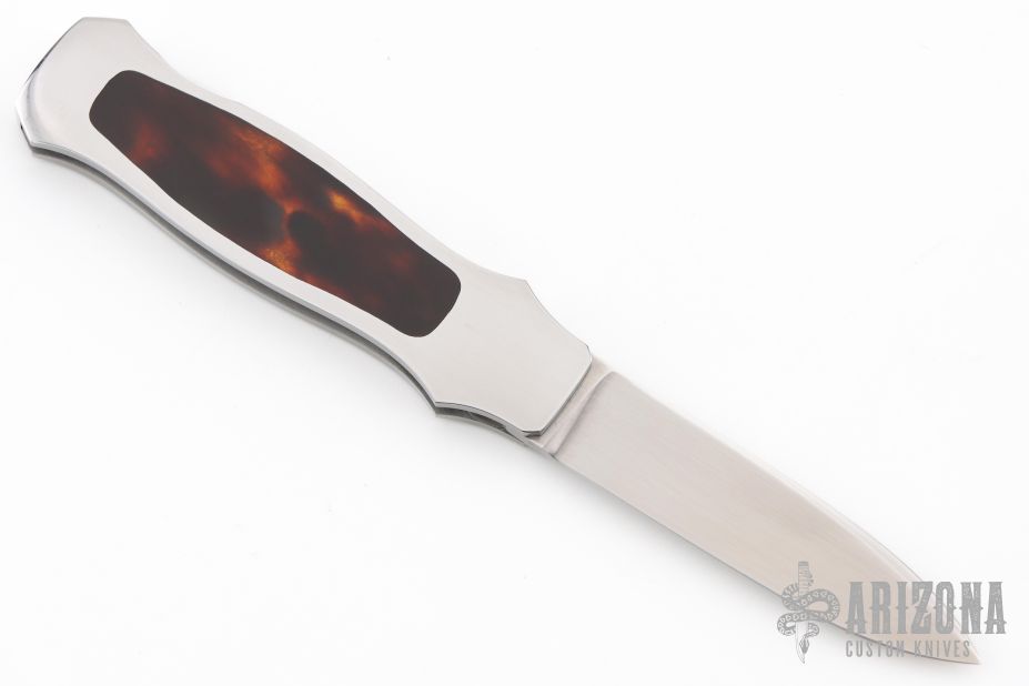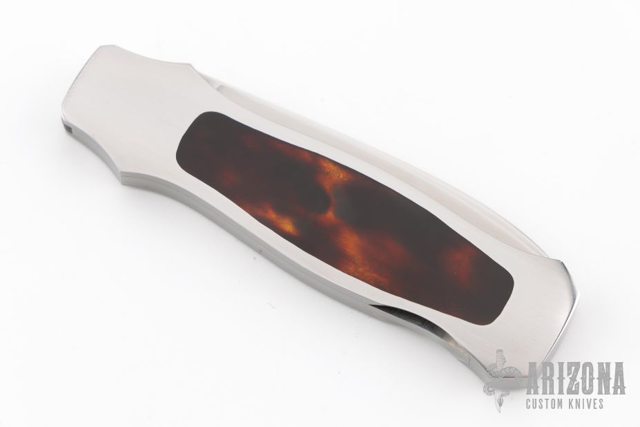 This Interframe lockback folder from Jack Busfield features a hand rub satin finished blade with a nail nick. The handle has a hand rub satin finished stainless steel frame with tortoise shell inlays and stainless steel lock spring. Excellent condition. Includes a zippered case. "010" inside the backspacer.