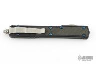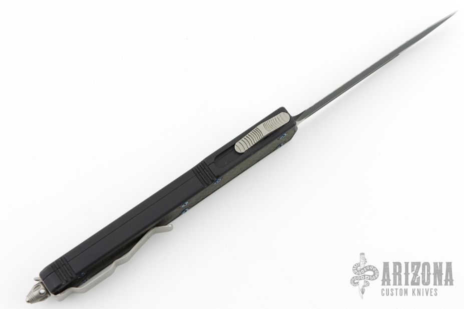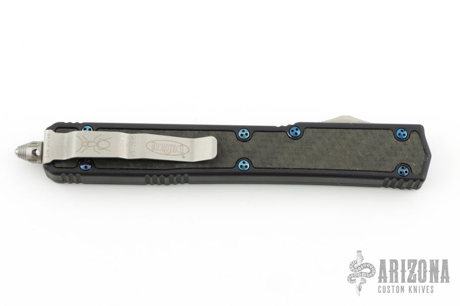 This Makora II OTF automatic by Microtech features a black double edge blade with one fully serrated edge. The handle has carbon fiber inserts on both sides of the black aluminum handle. Bead blast finished stainless steel clip, blue hardware and glass breaker at pommel. Dated 03/2015 and serial number 05749. Previous owner had the hardware anodized blue. Has some scuffs and scratches, great condition otherwise.