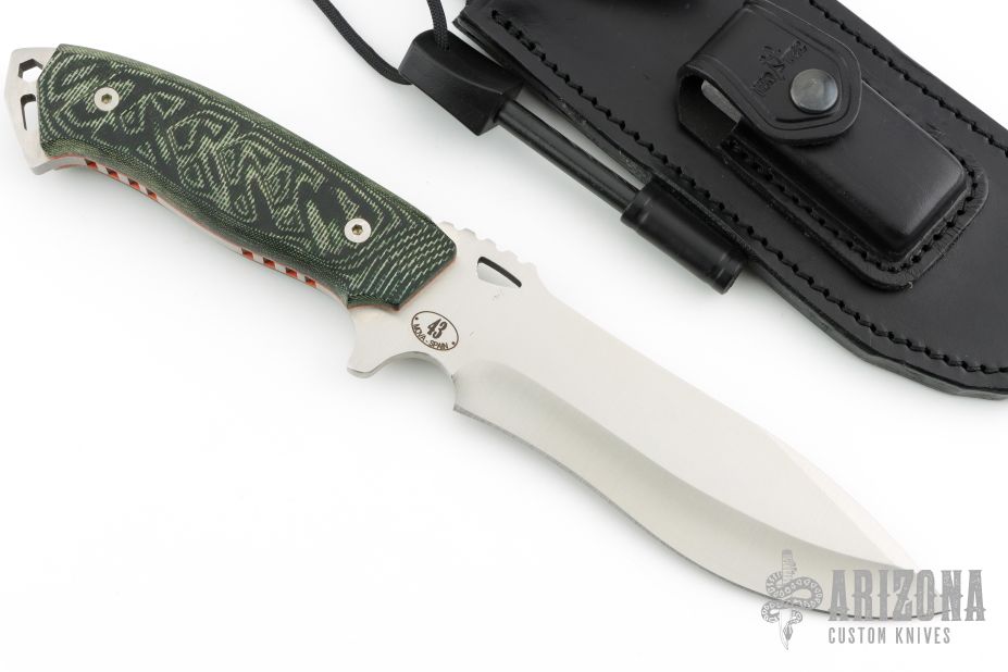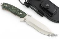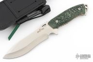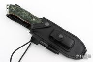 This knife by Jeo Tec features a Molybdenum-Vanadium (MOVA) blade with false top edge and a notched thumbrest, .211" blade stock and 1.771" blade depth, full tang construction. The handle has black/green scales. Comes with a black leather sheath with fire steel and sharpening stone. Has a couple light scuffs, excellent condition otherwise.