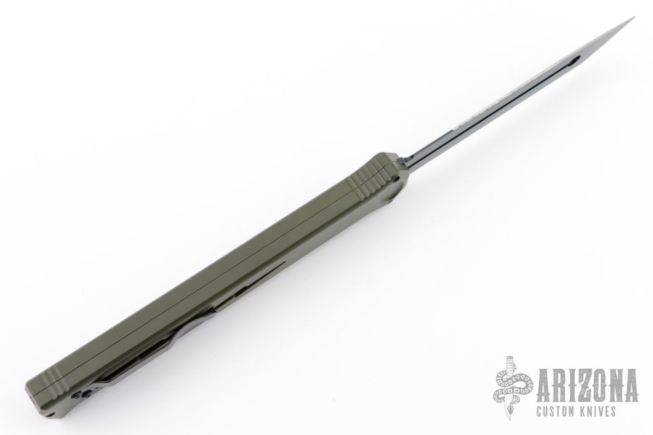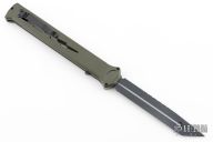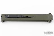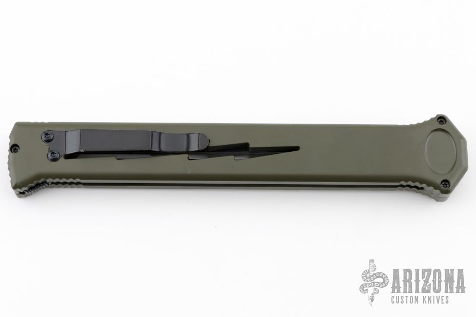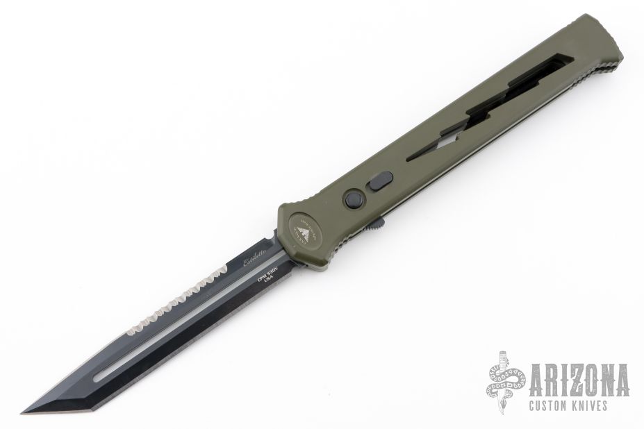 This Estiletto-T from Paragon features a black coated tanto style chisel ground blade with false top edge and serrations on the spine. The handle is green anodized 6061 aluminum. Black stainless steel tip down clip. Featurs a safety to keep from firing accidentally. Has a couple light scuffs, otherwise excellent condition.