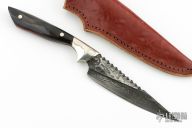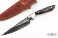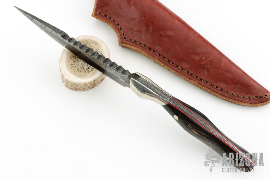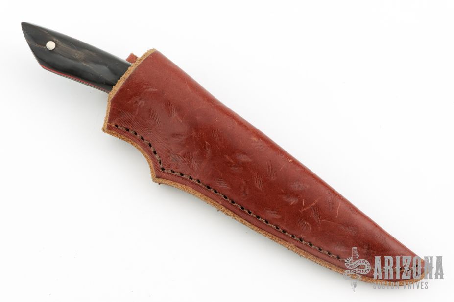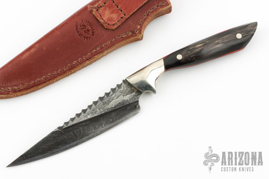 This knife by Chris Peterson features a Damascus blade with visible temper line, fileworked spine, .207" blade stock and 1.208" blade depth, full tapered tang construction. The handle has nickel silver bolsters, buffalo horn scales with red liners. Comes with a brown leather sheath. Has some patina on the tang and some light scratches, otherwise excellent condition.