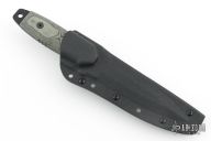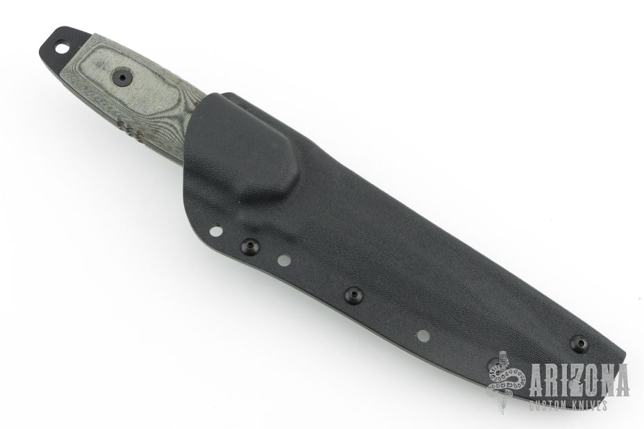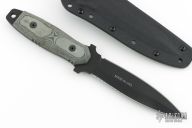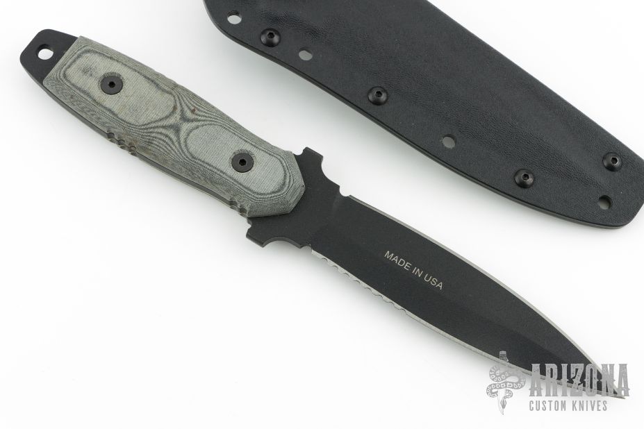 This knife has a black double edged blade with one partially serrated edge, .2" blade stock and 1.141" blade depth, full tang construction with black linen micarta scales and white liners. Comes with a kydex sheath. Excellent condition.