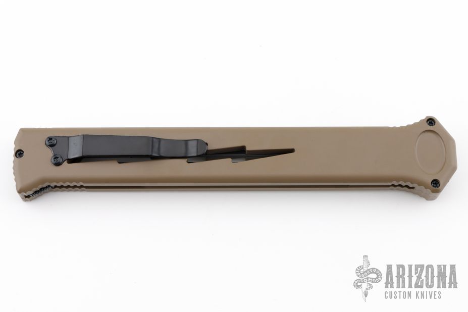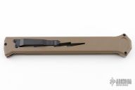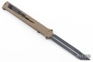 This Estiletto-T from Paragon features a black coated tanto style chisel ground blade with sharpened top edge. The handle is brown anodized 6061 aluminum. Black stainless steel tip down clip. Featurs a safety to keep from firing accidentally. Has a couple light scuffs, otherwise excellent condition.