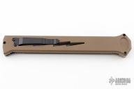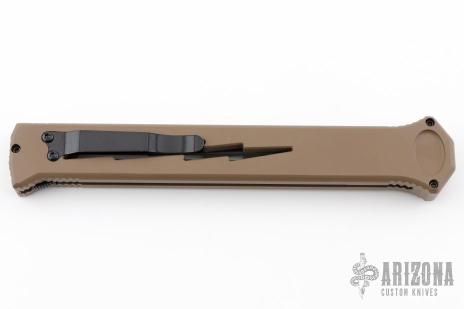 Joining the Estiletto OTF lineup is this fantastic model with a USA cutout on the tan anodized aluminum body with black hardware/clip and a black coated clip point blade with plain cutting edges.