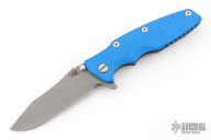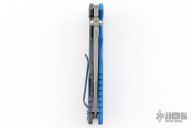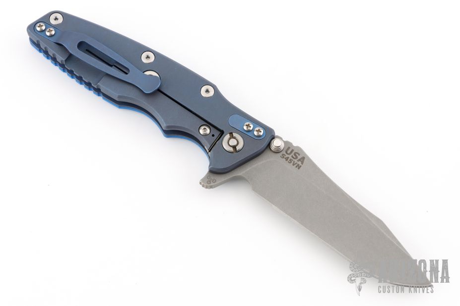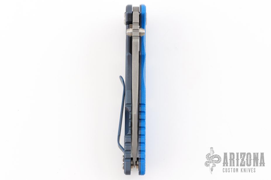 This Eklipse by Rick Hinderer features a stonewash finished blade with notched thumbrest and flipper. The handle has a battle blue titanium frame, blue G-10 scale, satin hardware, and a tip up or down reversible stonewashed and anodized titanium clip and filler tab, lanyard hole at the butt. New condition. Comes with original box and extra pivot hardware.