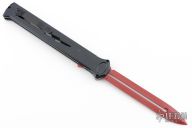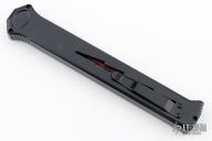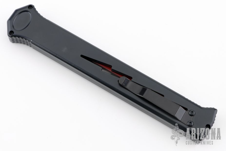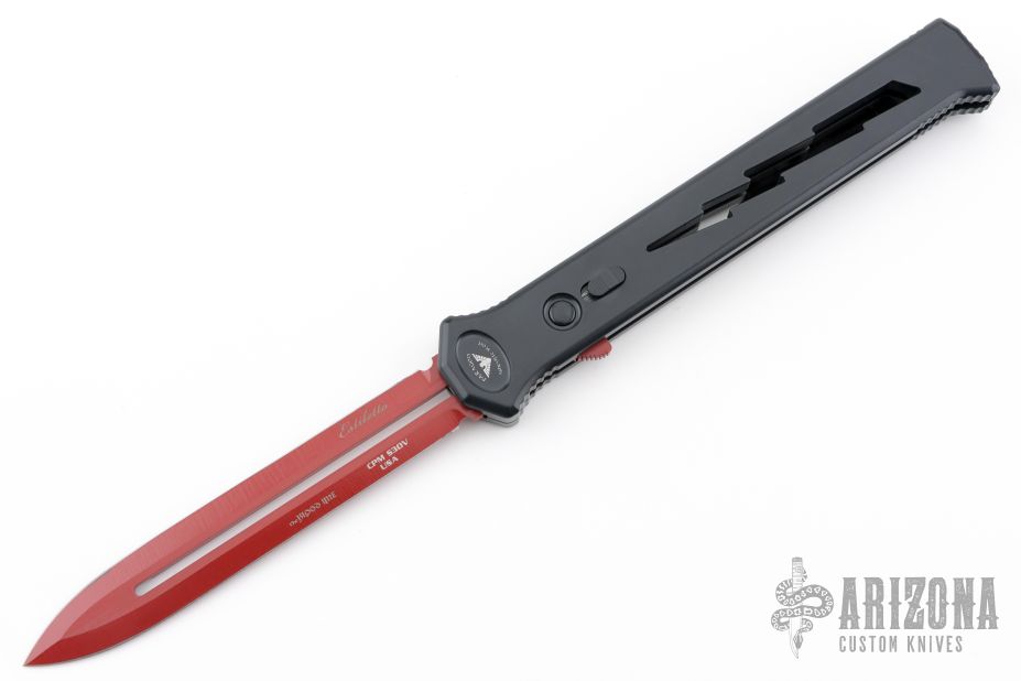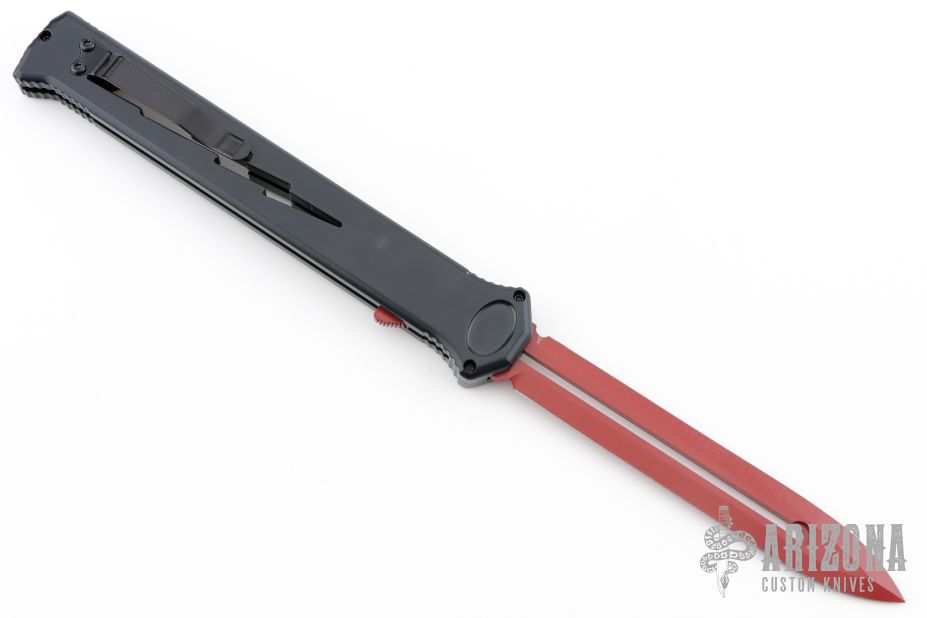 Joining the Estiletto OTF lineup is this fantastic model with a USA cutout on the black anodized aluminum body with black hardware/clip and a red coated dagger blade with plain cutting edges.