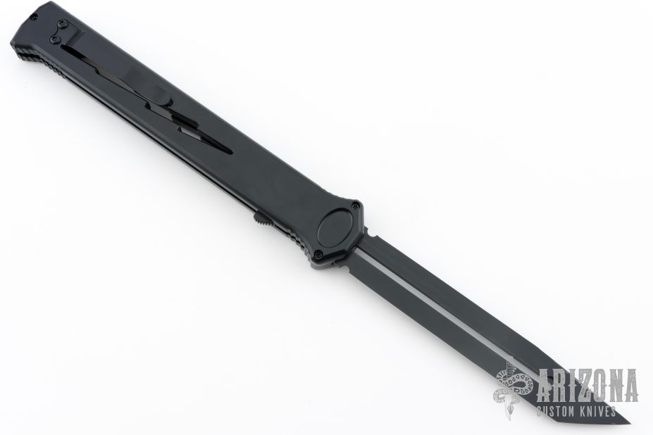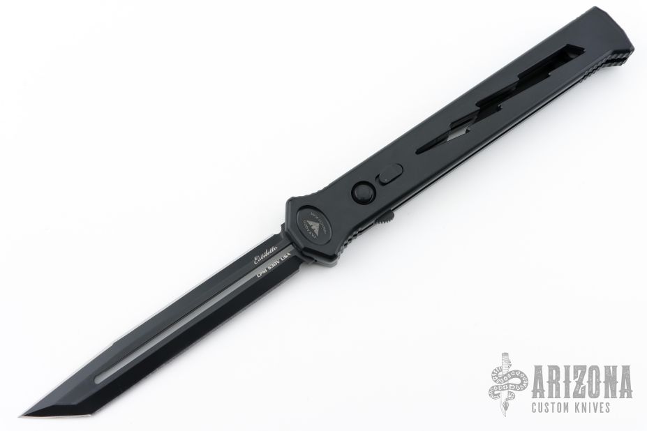 This Estiletto-T from Paragon features a black coated tanto style chisel ground blade with sharpened top edge. The handle is black anodized 6061 aluminum. Black stainless steel tip down clip. Featurs a safety to keep from firing accidentally. Has a couple light scuffs, otherwise excellent condition.