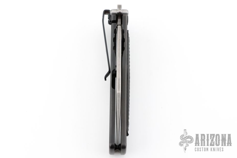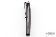 This Madd Maxx 4" Assisted Flipper is a Darrel Ralph Design executed by HTM Knifes. It features a stonewashed tanto blade with false top edge, fullers, dual thumb studs and flipper. The handle is comprised of a black titanium frame with carbon fiber overlay over barrel spacers. Black coated steel tip down clip and lanyard hole in pommel. Includes padded and zippered case, original box and papers. Excellent condition.