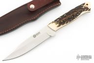 This slim hunter, with its full tang construction, offers an extremely high level of stability. The tapered tang ensures outstanding ergonomics and perfect balance. The hand picked stag scales have a red fiber underlay, for a discreet and elegant contrast. The blade is crafted of high performance Bohler N695 steel. Comes with original sheath of Argentinean cowhide. Blade Steel: Bohler N695