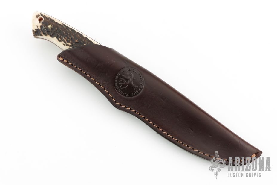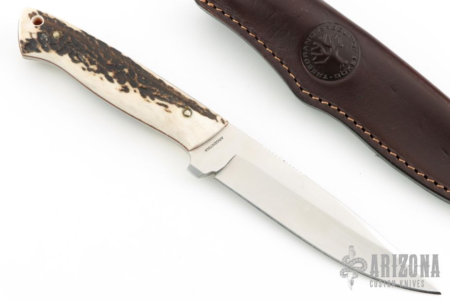 This slim hunter, with its full tang construction, offers an extremely high level of stability. The tapered tang ensures outstanding ergonomics and perfect balance. The hand picked stag scales have a red fiber underlay, for a discreet and elegant contrast. The blade is crafted of high performance Bohler N695 steel. Comes with original sheath of Argentinean cowhide. Blade Steel: Bohler N695