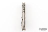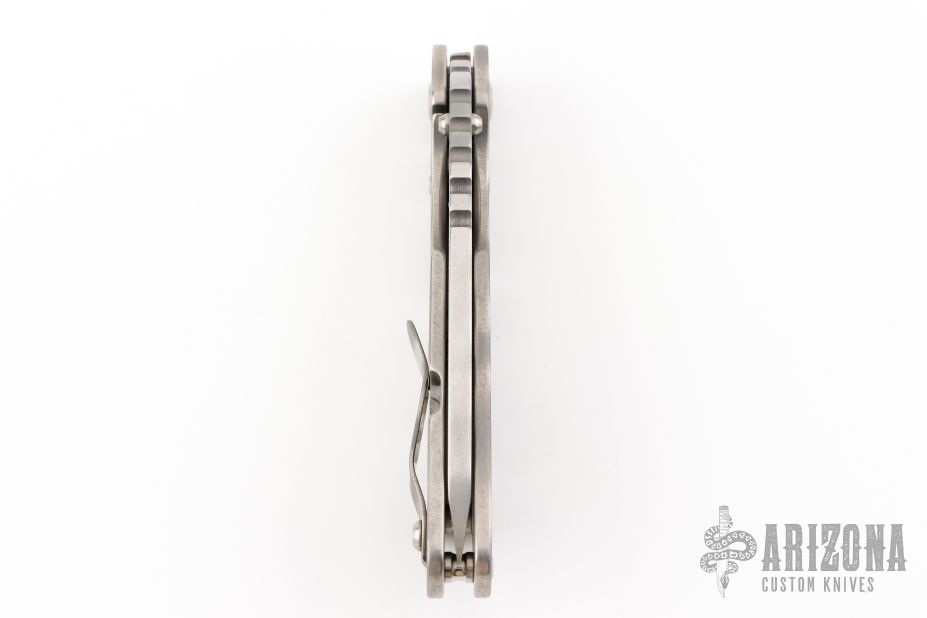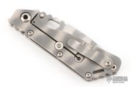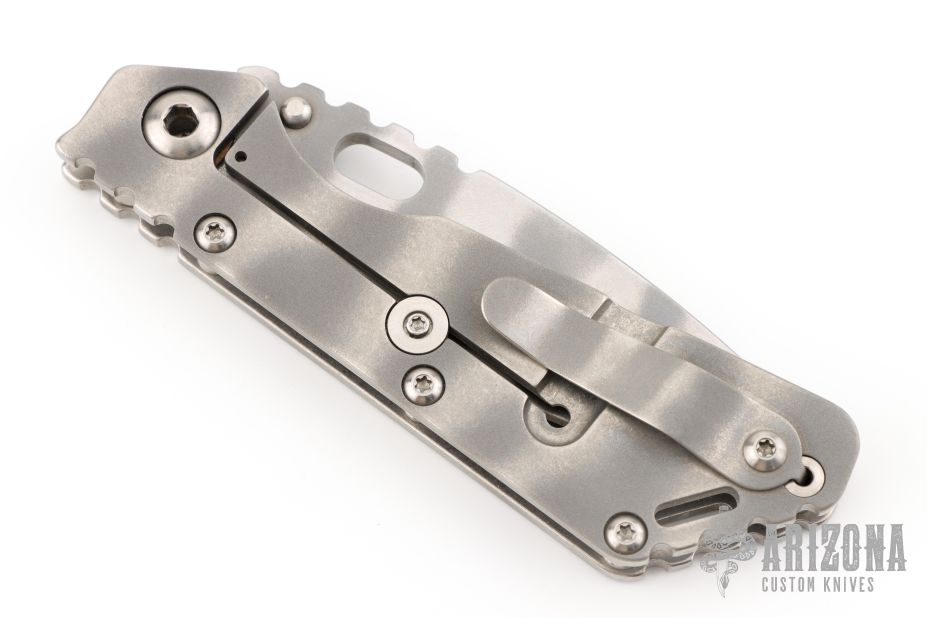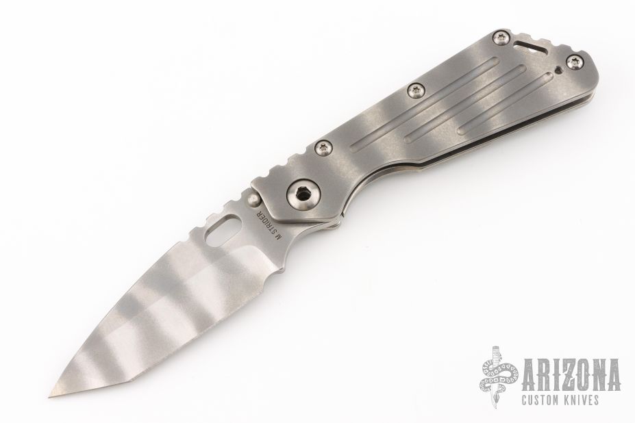 This Mick Strider Performance Series SMF framelock folder features a ghost stripe tanto blade with thumbhole and notched thumbrest. The handle has a ghost striped titanium frame with titanium clip, tip up carry. Jimping on blade spine. Includes Hinderer "Lock Bar Stabilizer" for maximum reverse lock retention. Nice detent, lockup and blade seating. Excellent condition.