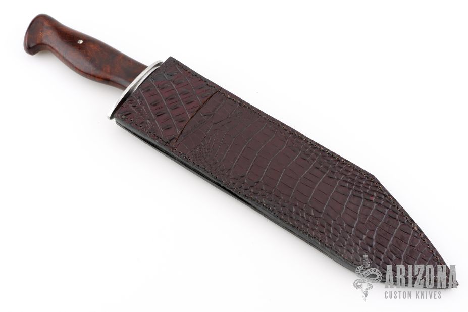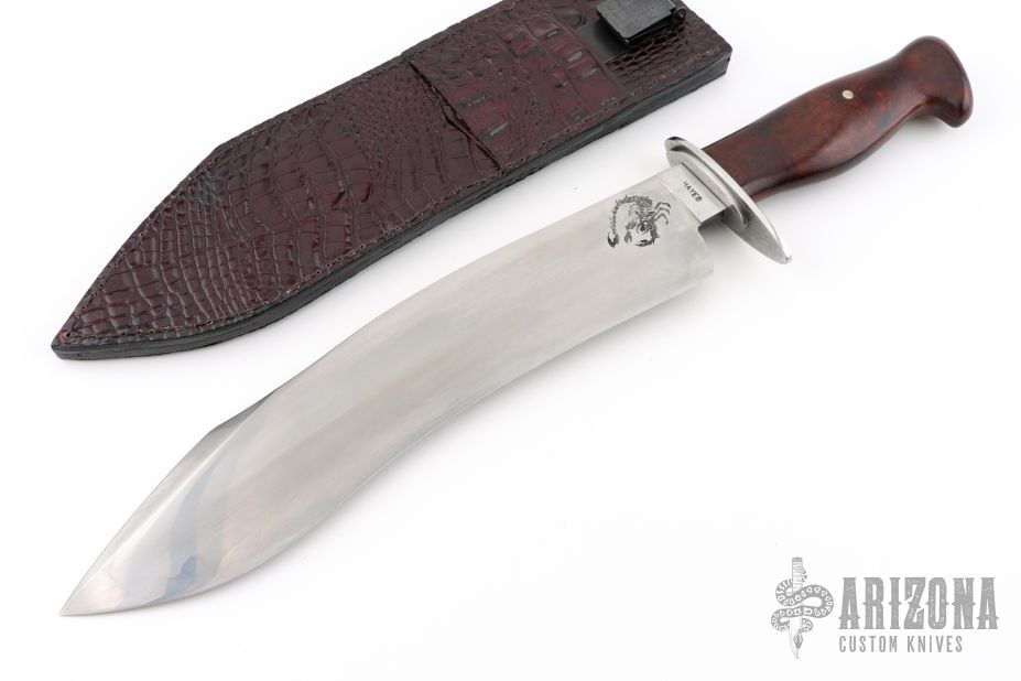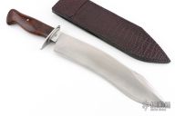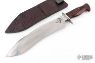 This Kukri by Master Smith Wally Hayes features a hand forged hand rub satin finished blade with sharpened top edge and nice hamon, .267" blade stock and 2.235" blade depth, hidden tang construction. The handle has a stainless steel guard, desert ironwood burl grip with a nickel silver pin. Comes with a black leather sheath with alligator skin overlay. Has a couple light scratches, otherwise excellent condition.