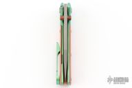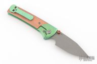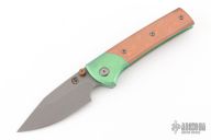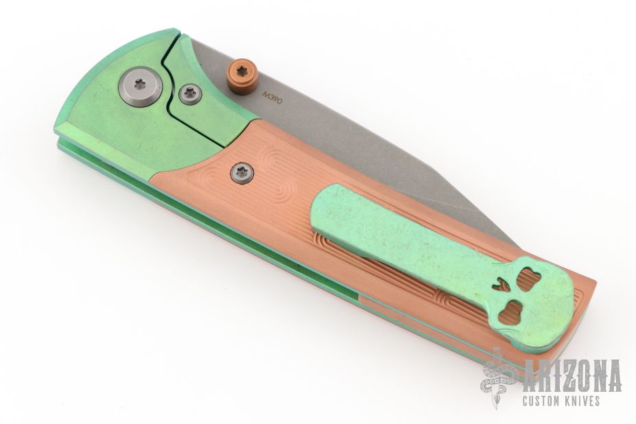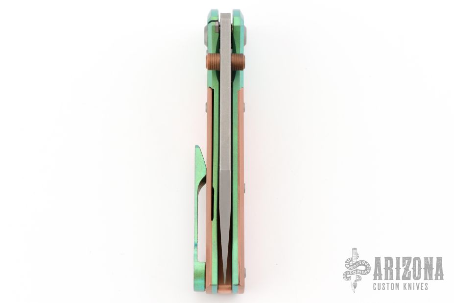 This knife features a dark stonewashed drop point blade with dual copper thumbstuds. The handle has anodized titanium blisters/liners/pocket clip and copper scales. Includes the original box and papers. Excellent Condition.
