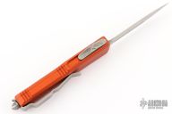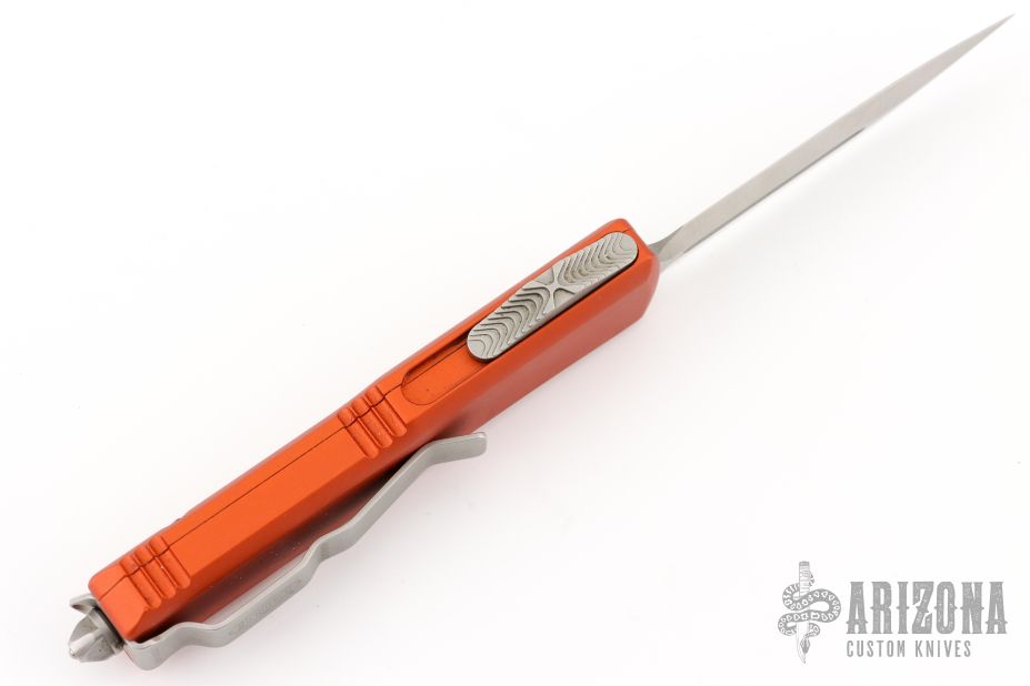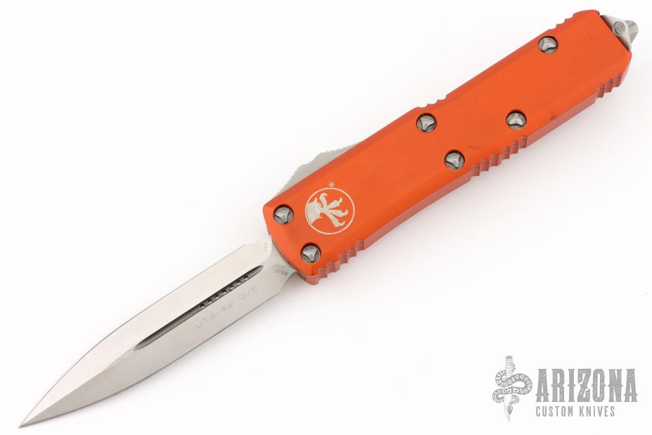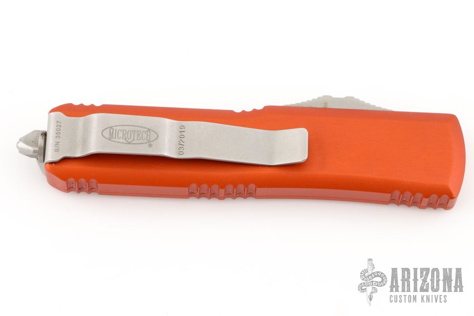 This UTX-85 automatic by Microtech features a D/E blade with standard edges. The handle has an orange aluminum frame. Stainless steel clip. Glass breaker. Serial number 635027 and dated 03/2019. Has some light scuffs and scratches, great condition otherwise.
