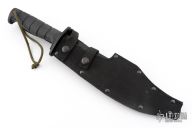 This knife by Ontario features a black blade with false top edge, .252" blade stock and 2.050" blade depth, hidden tang construction. Rubber handle with a lanyard hole. Comes with original nylon sheath and box. Has been used, has scuffs and scratches, good user condition.