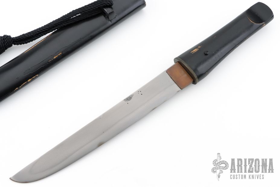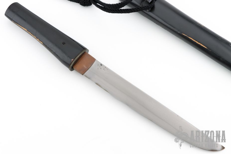 This Tanto by Kaji Customs features a hand forged blade with Hamon made from pick axe steel, .279" blade stock and 1.055" blade depth, hidden tang construction. The handle has a copper habiki and a steel tsuba, black laquered alder wood grip with a black lacquered maple butt. Comes with a black lacquered wooded saya. New from maker. Comes with a hand written materials list.