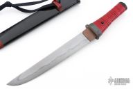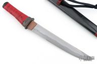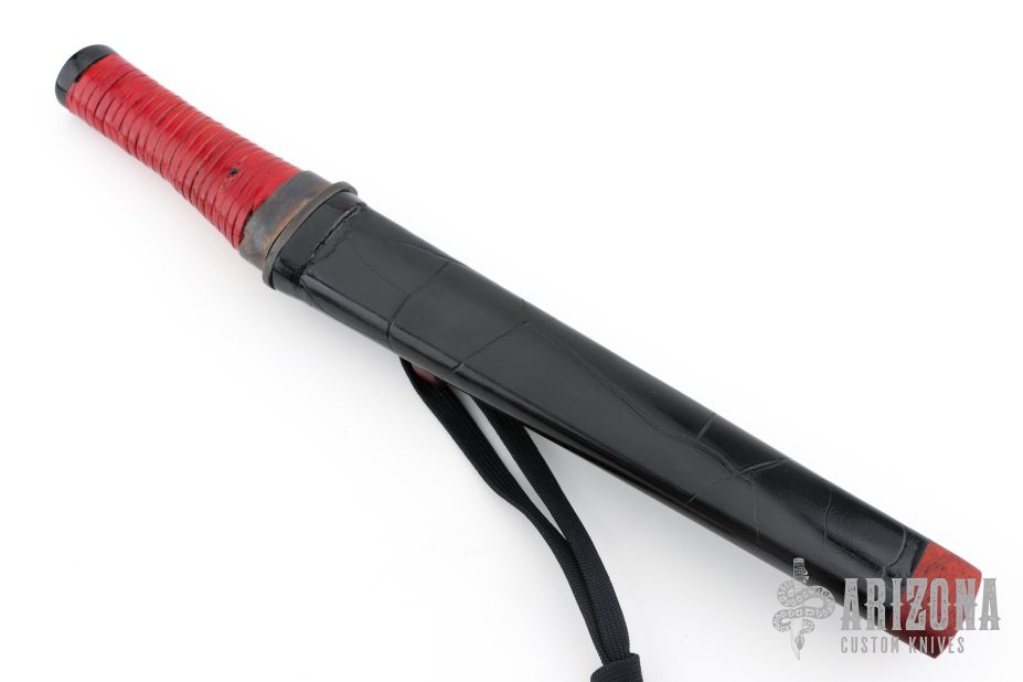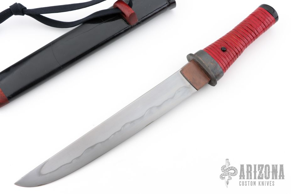 This Tanto by Kaji Customs features a hand rub satin finished blade with Hamon, .245" blade stock and 1.162" blade depth, hidden tang construction. The handle has a copper habiki, iron tsuba and copper fuchi, red deer skin tsuka-ito, black padauk wood kashiri. Comes with a black lacqured wood saya. New from maker. Comes with hand written material list.