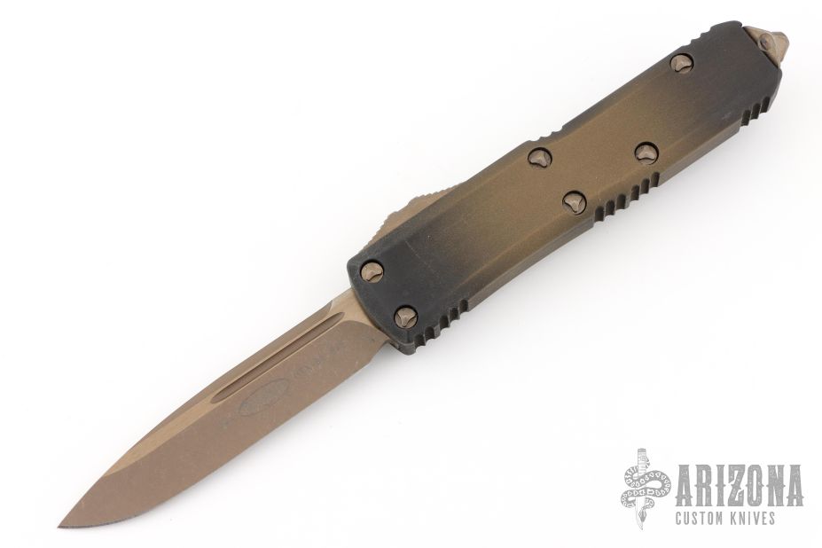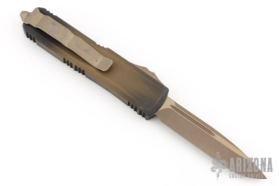 This UTX-85 by Microtech features a bronzed antique finished blade. The handle has a bronzed aluminum frame with bronzed hardware and tip down clip. Comes with original box and papers. Dated 04/2022 and s/n 068. Has some scuffs and scratches, great condition otherwise.