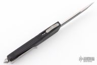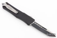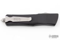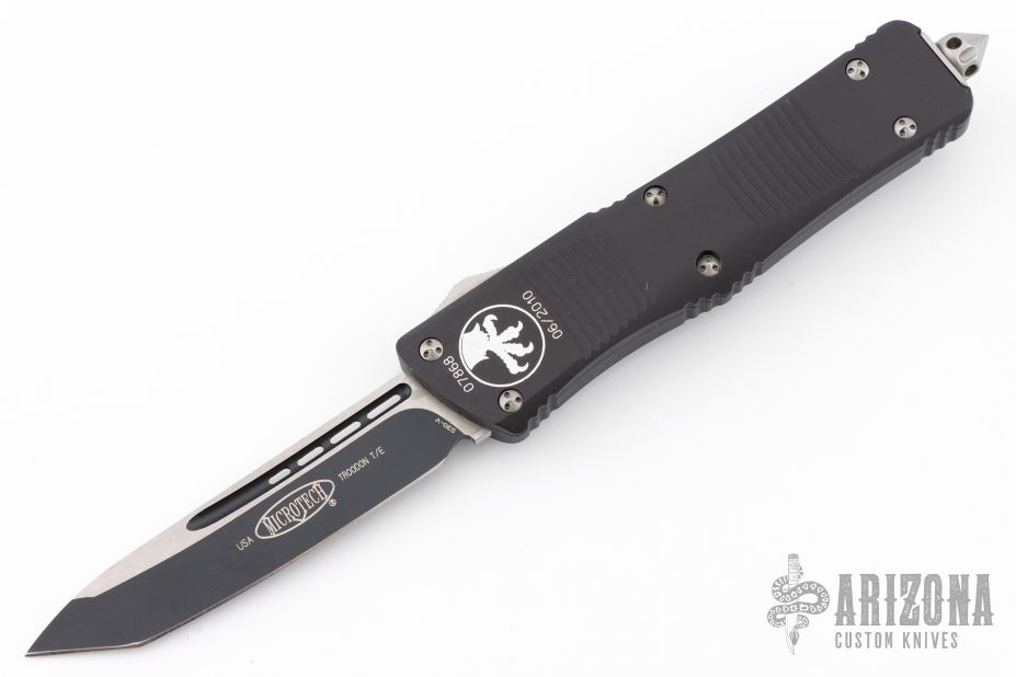 This Troodon automatic by Microtech knives features a black tanto blade with fullers. The handle has a black aluminum frame with thumb-slide, glass breaker, and tip down clip. Dated 06/2010 with a S/N of 07868. Has some light scuffs, otherwise excellent condition.
