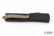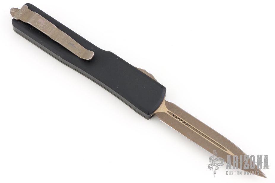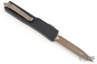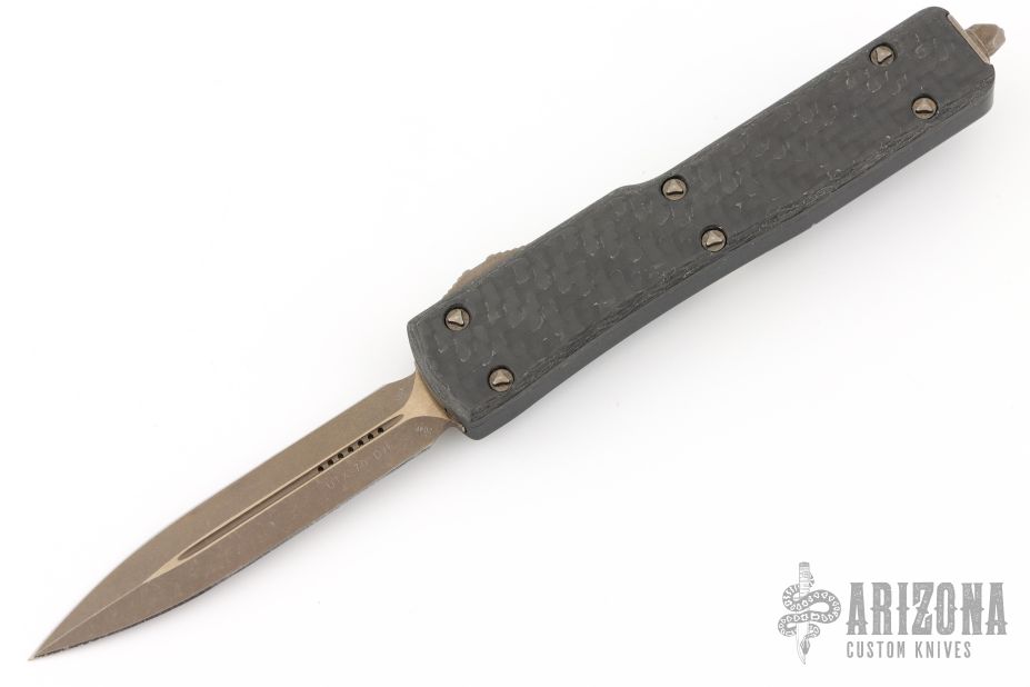 This UTX-70 OTF automatic by Microtech features a T/E bronzed tumble finished blade with a standard edge. The handle has a carbon fiber top, and black aluminum frame with matching stainless steel tip down clip. Serial number 117 and dated 09/2020. Has some light scuffs and scratches, great condition otherwise.