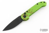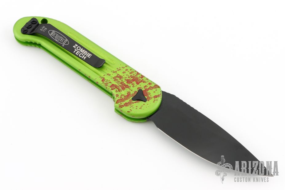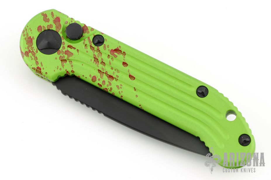 This LUDT side opening automatic by Microtech has a black finished blade with a standard edge and a contoured green aluminum frame. Stainless steel clip. Serial number 115. Excellent condition.