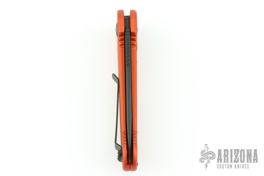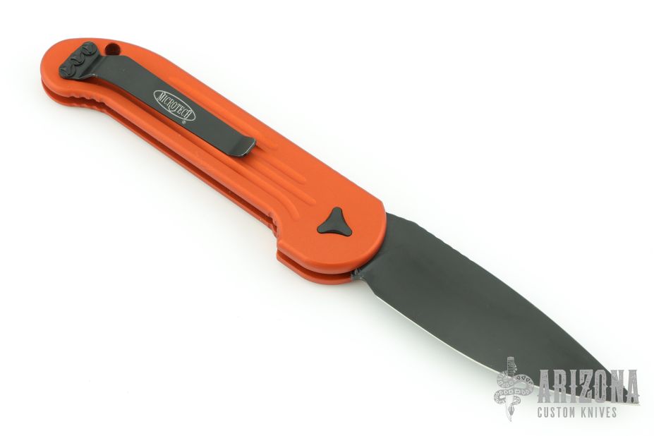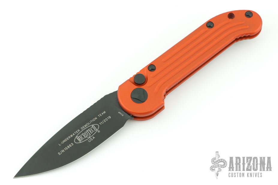 This LUDT side opening automatic by Microtech has a black blade with a standard edge and an orange aluminum frame. Stainless steel clip. Dated 11/2019 and serial number 15863. Excellent condition.