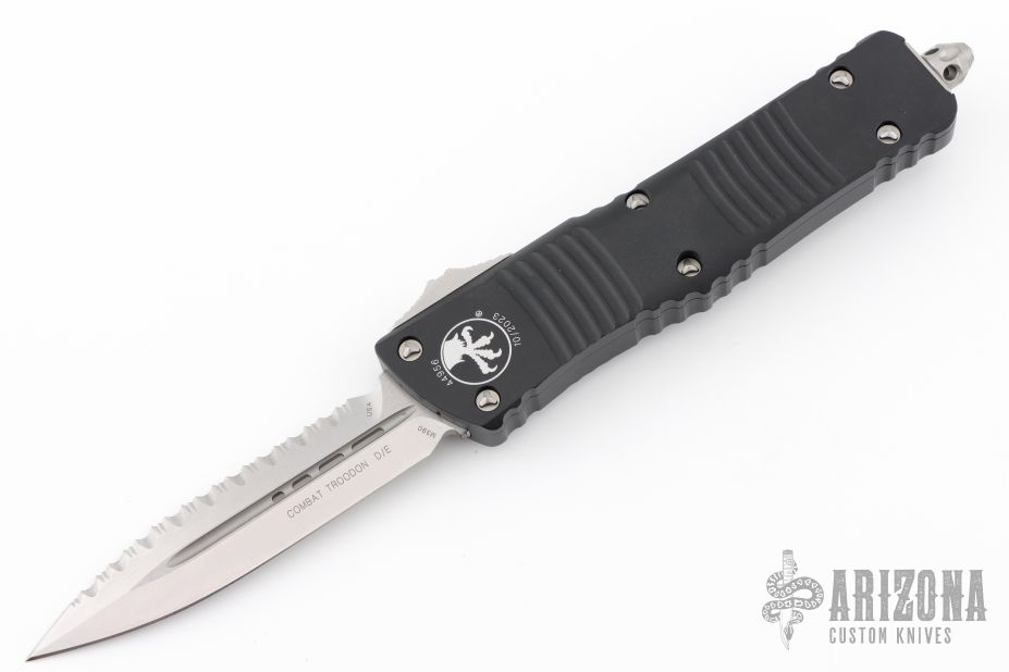 This Combat Troodon OTF automatic features a stonewash finish D/E blade with a fully serrated edge. Stainless steel clip. Glass breaker. S/N 44956 Dated 10/2023. Excellent condition.