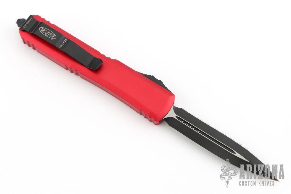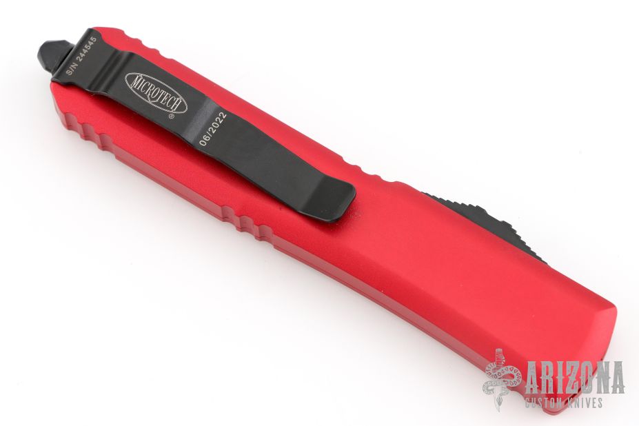 This Ultratech OTF automatic by Microtech features a D/E black blade with one fully serrated edge. Red aluminum contoured frame with black hardware and tip down stainless steel clip. Dated 06/2022 and s/n 244545. Excellent condition.