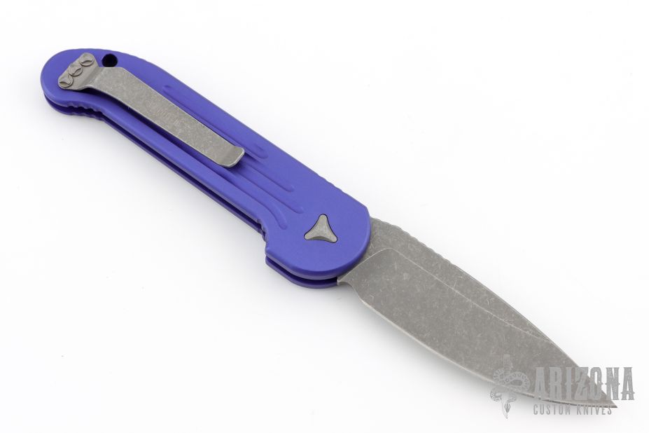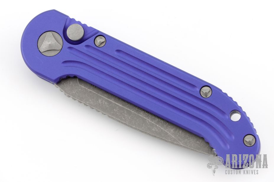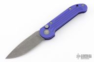 This LUDT side opening automatic by Microtech has an apocalyptic finished blade with a standard edge and a purple aluminum frame. Stainless steel clip. Dated 03/2020 and serial number 17428. Excellent condition.