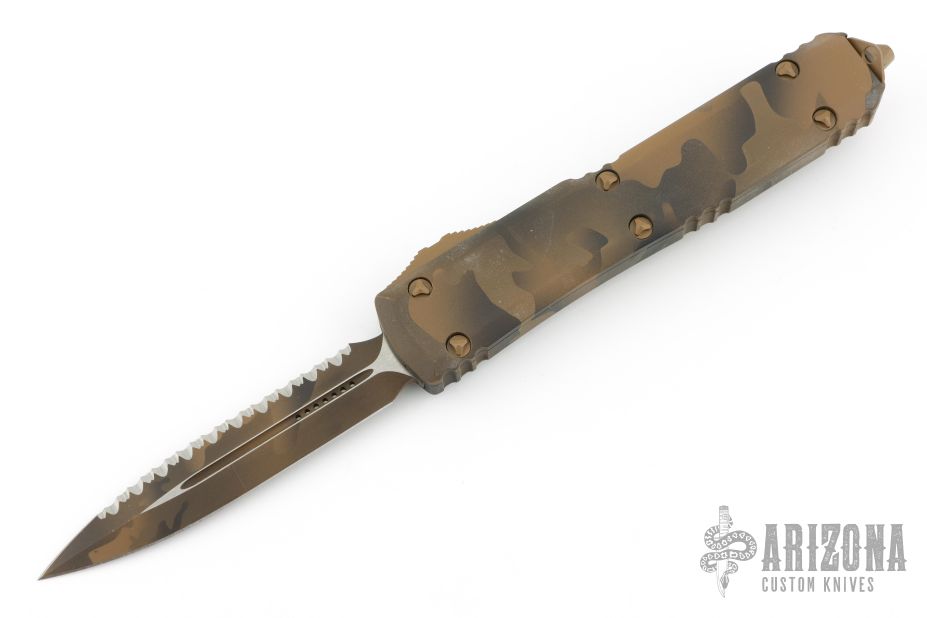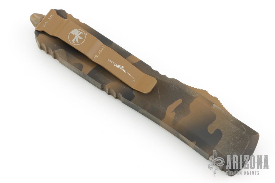 This Ultratech OTF automatic by Microtech features a D/E Coyote Camo blade with one fully serrated edge. Coyote Camo aluminum contoured frame with coyote hardware and tip down stainless steel clip. Dated 09/2022 S/N 525. Has some light scuffs and scratches excellent condition otherwise.