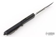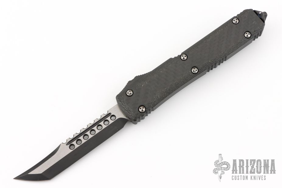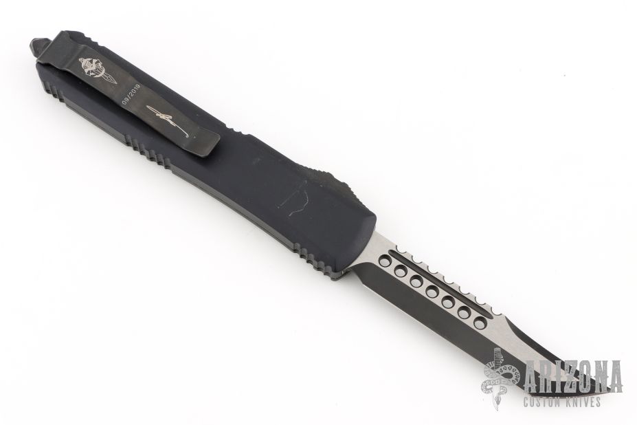 This Ultratech Hellhound Tanto by Microtech features a two-tone blade with tumbled DLC finished grinds with satin finished flats, notched thumbrest and a nearly sharpened top edge. The handle is black aluminum with satin finished hardware and black clip, has a carbon fiber top. Dated 09/2019. Hardware has been swapped out by the previous owner. Has some light scuffs, excellent condition otherwise.