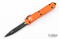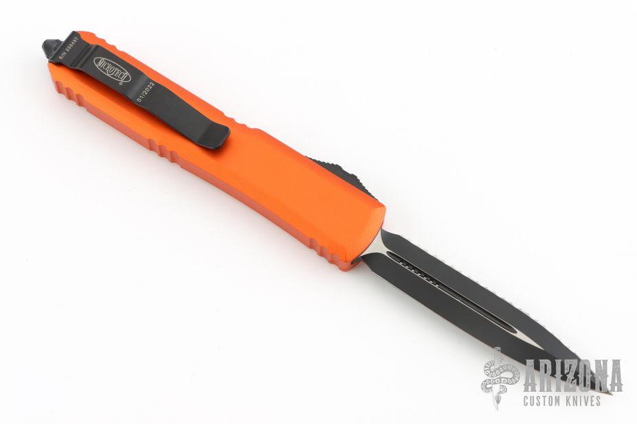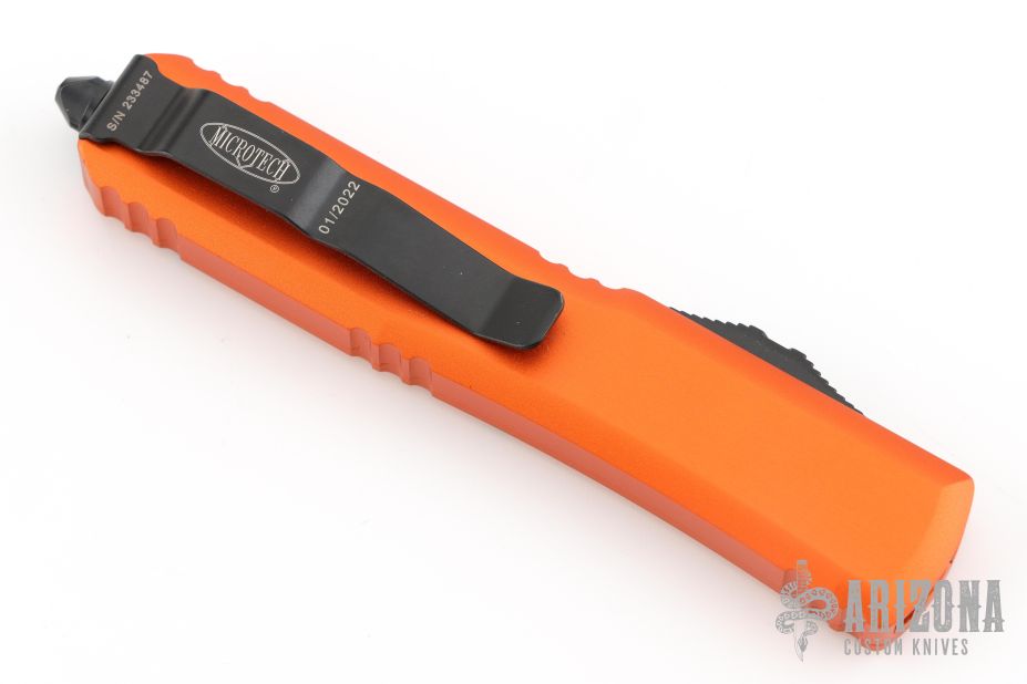 This Ultratech OTF automatic by Microtech features a D/E black blade with one fully serrated edge. Orange aluminum contoured frame with black hardware and tip down stainless steel clip. Dated 01/2022 and s/n 233487. Excellent condition.