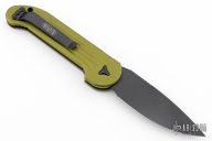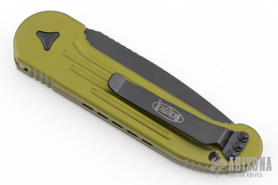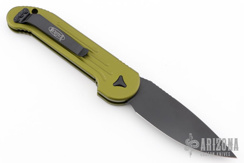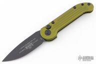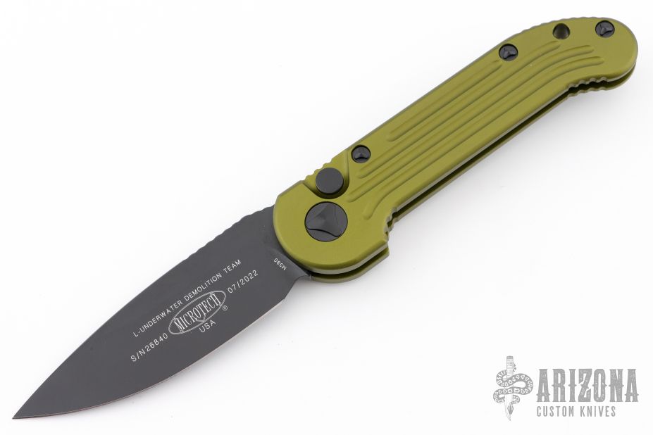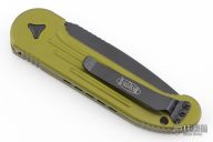 This LUDT side opening automatic by Microtech has a black blade with a standard edge and a green aluminum frame. Stainless steel clip. Dated 07/2022 and serial number 26840. Excellent condition.