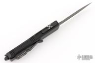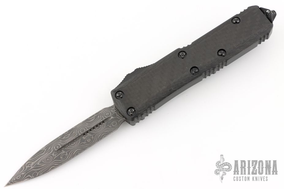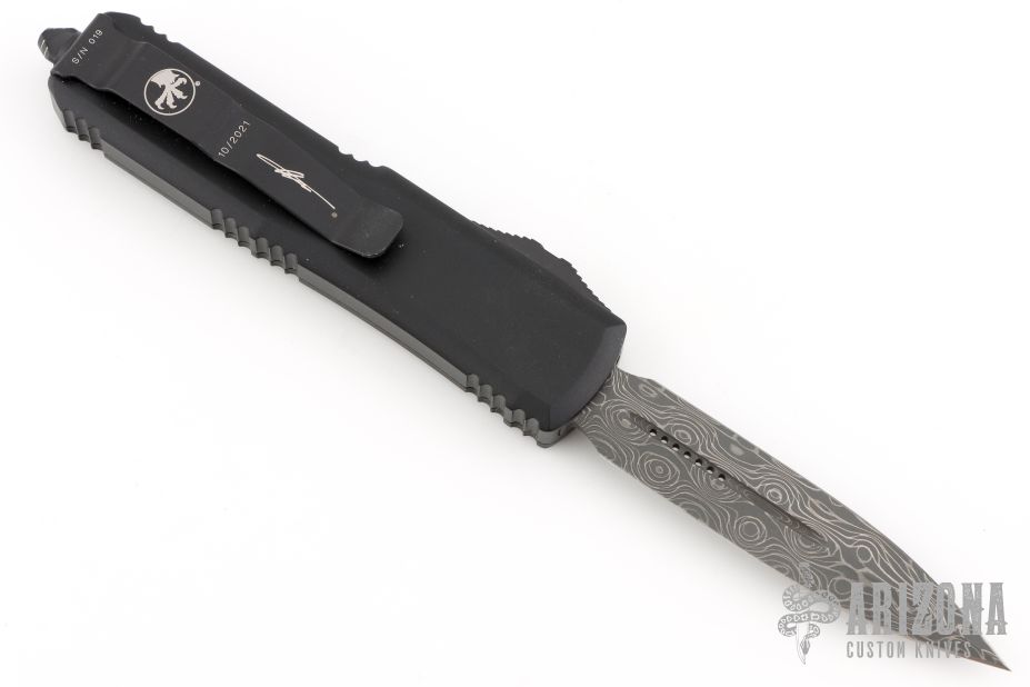 This UTX-85 by Microtech features a double edged spirograph Damascus blade. The handle has a black aluminum frame with a carbon fiber top, black ringed hardware and black tip down clip. S/N 019 and dated 10/2021. Has some light scuffs, excellent condition otherwise.
