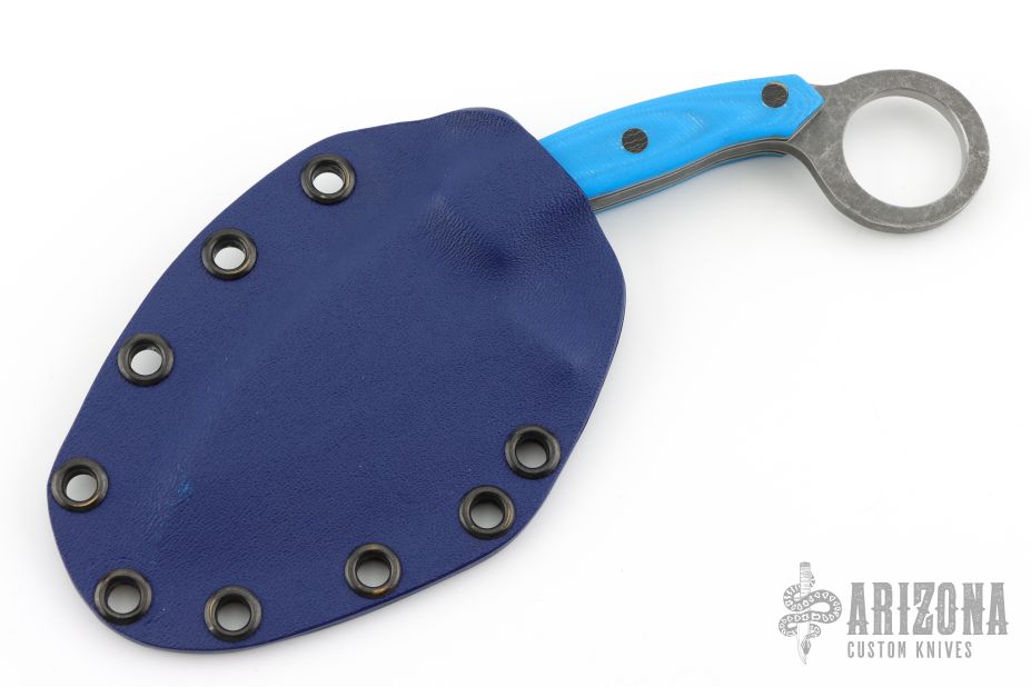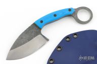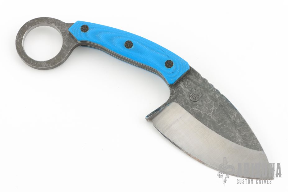 This karambit features a satin finished blade with acid stonewashed flats, notched thumbrest, .177" blade stock and 1.607" blade depth, full tang construction. The handle has blue G-10 scales with black and gray liners. Comes with a kydex sheath. Has a few light scratches, otherwise excellent condition. "SS BW" inside a shield is the makers mark. Please let us know if you know who this is.