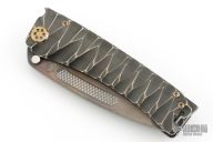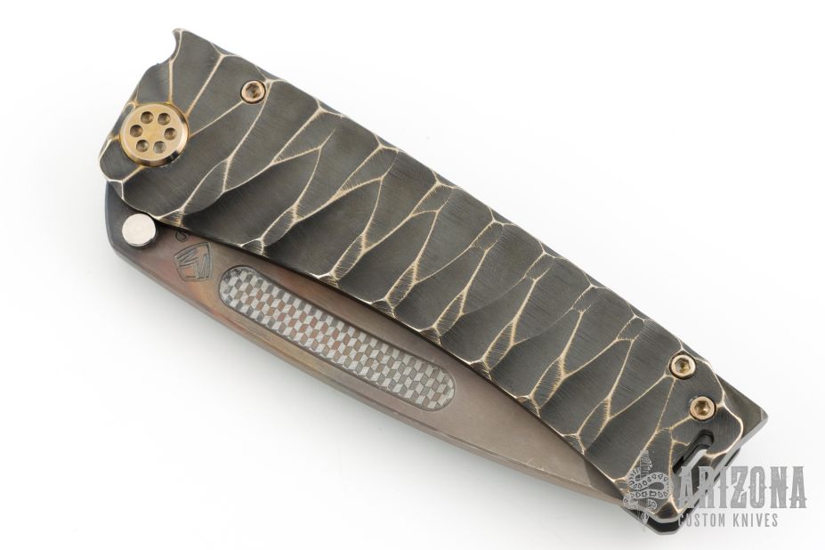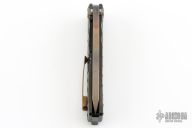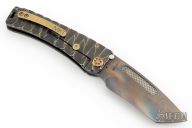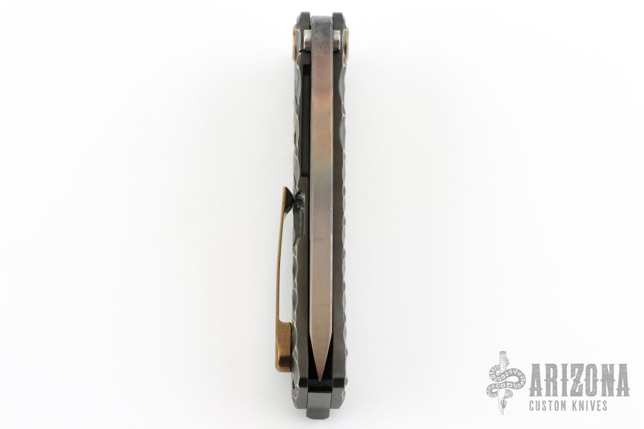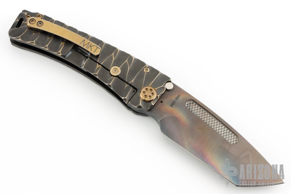 This Marauder from Medford Knife and Tool features a vulcan finish tanto blade with laser engraved fullers. The handle has a textured and anodized titanium frame over a steel backspacer and titanium tip up clip. Includes original box and hard case. Comes with COA dated January 20, 2022. Has some scuffs, otherwise excellent Condition.